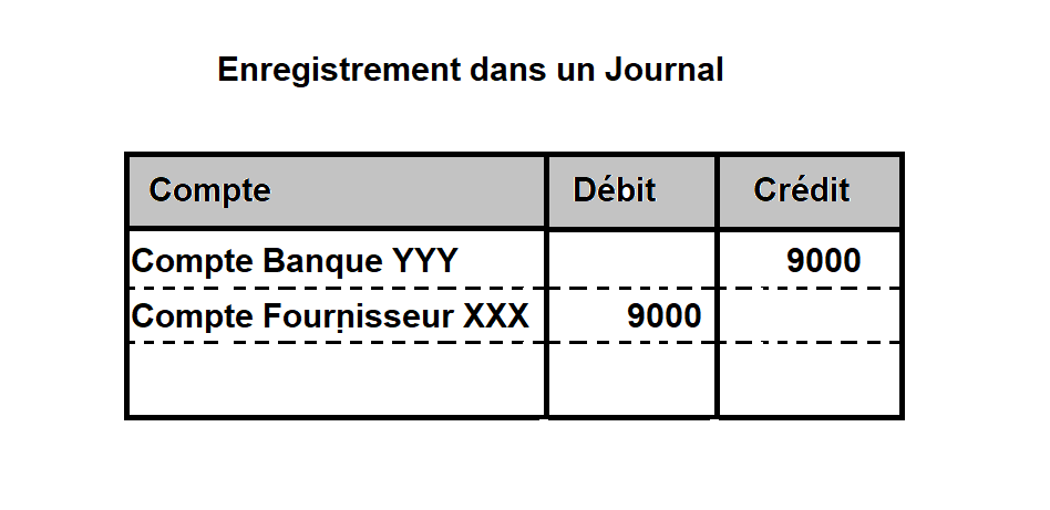 Considérons que l'entreprise a payé son fournisseur (Fournisseur XXX) et que, pour cela, elle a établi un chèque à partir de son compte bancaire (Compte Bancaire YYY)